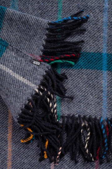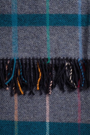 Šedá deka s barevným snováním a tyrkysovými nepravidelnými pruhy v útku.