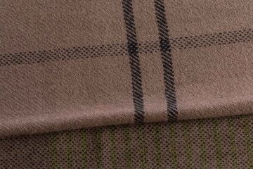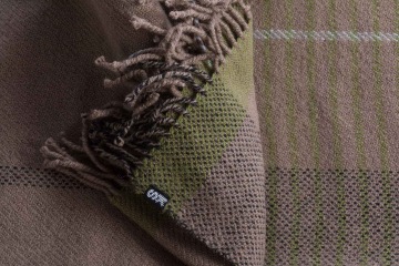 Béžová deka s barevným snováním s černými a zelenými nepravidelnými pruhy v útku.