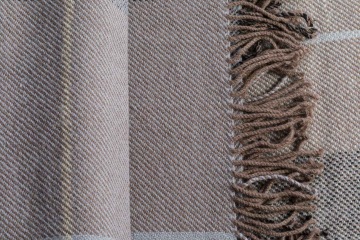 Béžová deka s barevným snováním a modro-bílým útkem s bílými nepravidelnými pruhy v útku.