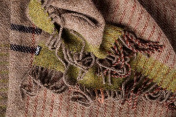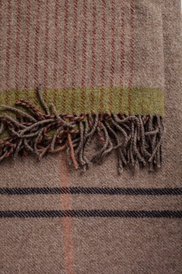 Béžová deka s barevným snováním s černými a zelenými pruhy ke konci deky.