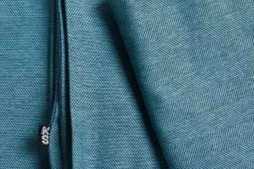 Na černé osnově se v pravidelných pruzích střídá směr keprové vazby, modré barvy.