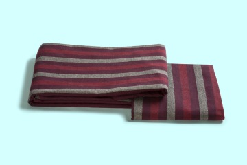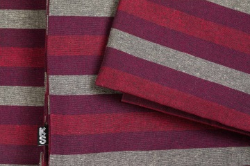 Na černé osnově se pravidelně střídají barevné pruhy v útku, režno-červeno-bordó barvy.