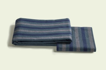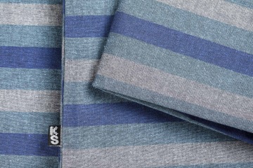 Na černé osnově se pravidelně střídají barevné pruhy v útku, bílo-světle modro-tmavě modré barvy.