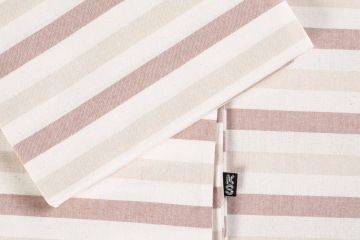 Na režné osnově se pravidelně střídají barevné pruhy v útku, režo-béžovo-hnědé barvy.