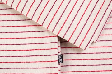 Na režné osnově se v útku střídají dvě tkalcovské vazby v pravidelných pruzích, růžovo-červeno-bordó barvy.