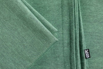 Na černé osnově se v pravidelných pruzích střídá směr keprové vazby, zelené barvy.
