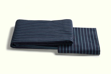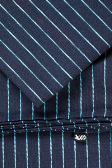 Na černé osnově se v útku střídají dvě tkalcovské vazby v pravidelných pruzích, tmavě modro-světle modré barvy.
