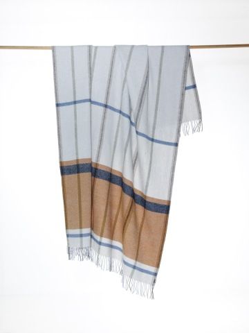 Světle šedá osnova s černo-modro-zeleno-béžovým nepravidelným snováním, protkaná režno-modro-černo-pískovým útkem v nepravidelných pruzích.