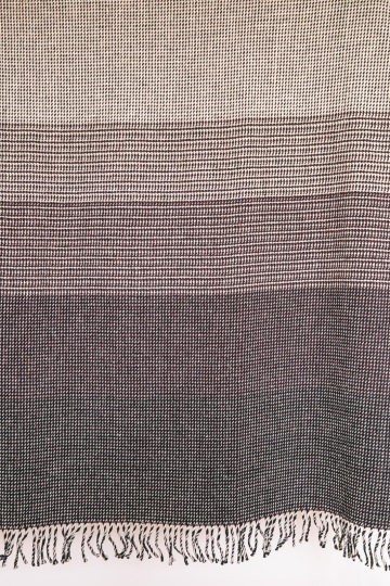 Černo-režná osnova protkaná bordo-černo-růžovo-režným útkem.