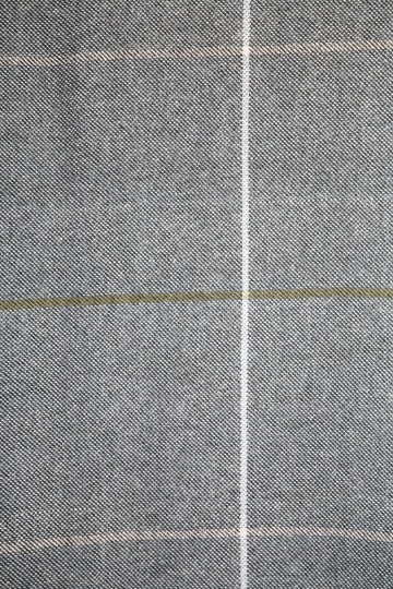 Černá osnova s režnými nepravidelnými pruhy protkaná šedo-modro-režným útkem se zeleno-režnými pruhy, vytvářející kostky.