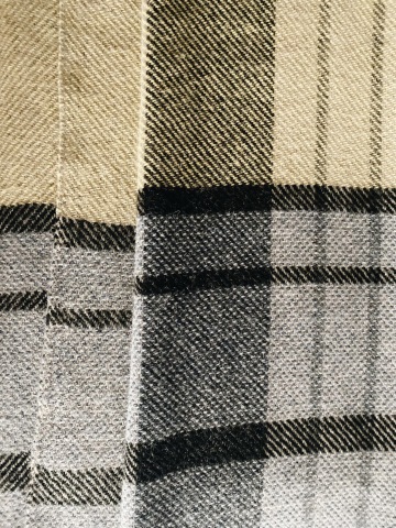 Světle šedá osnova s tmavě šedým nepravidelným snováním protkaná šedo-modro-žluto-černým útkem v nepravidelných pruzích.