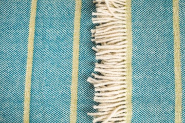 Režná osnova s tyrkysovo-zelenou kombinací v útku. V pravidelných pruzích se střídají dvě tkalcovské vazby a tím vzniká větší plastičnost pruhů.